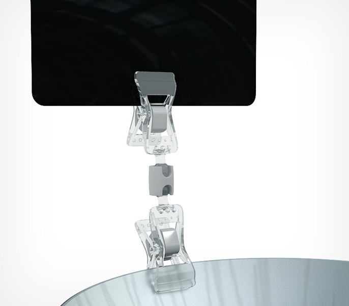 Универсальный ценникодержатель с прищепками, малый надевается на торец полки, край коробки, корзины, блюда, толщиной до 10 мм.