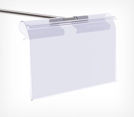 Подвешивается на T-образные одинарные или двойные  металлические крючки. При снимании товара с крючка откидывается вверх, затем  возвращается в исходное положение. Высота ценникодержателя 39 мм.