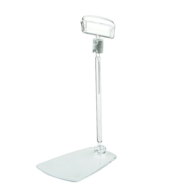 Шарнирный ценникодержатель на прямоугольной подставке. Удлиненная подставка удобна для использования ценникодержателя в отделе «Гастрономия». Шарнирные соединения обеспечивают максимальную гибкость использования.
