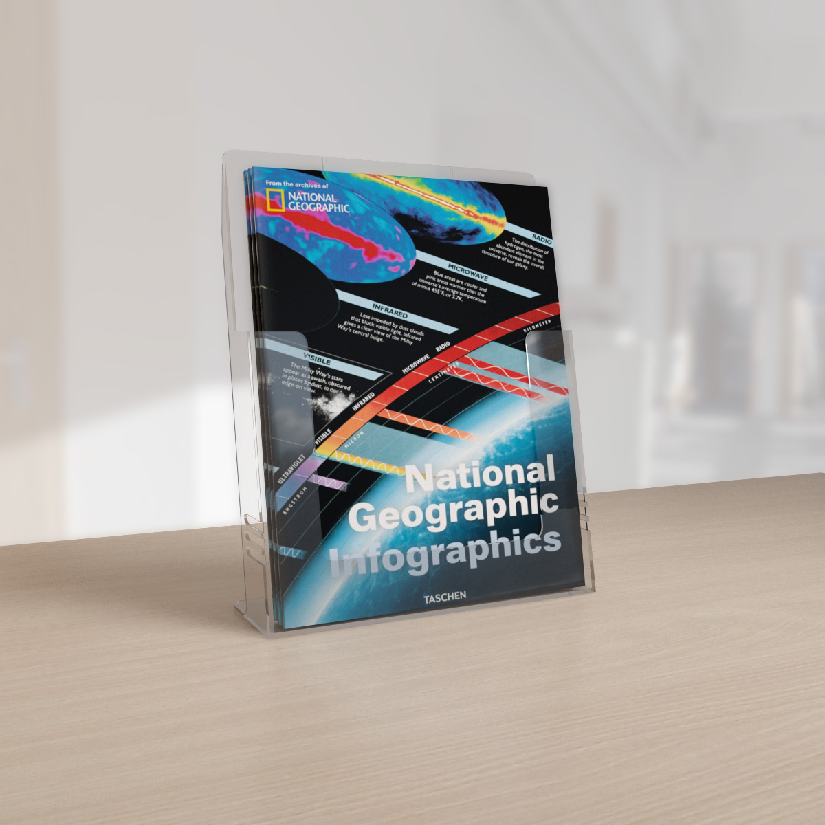 Универсальный держатель буклетов. Может располагаться на столе или крепится к стене. Изготовлен методом литья под давлением.