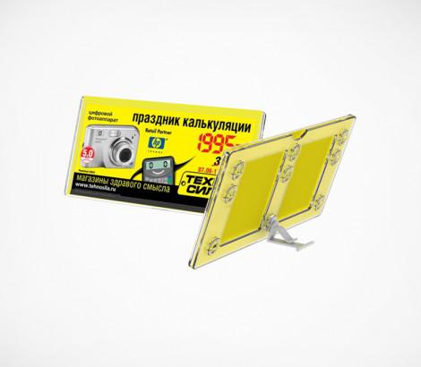 Универсальная рамка-ценникодержатель с девятью гнездами крепления рамки на разных уровнях относительно полки. Прорезь для рамки по широкой стороне рамки. Размер вставки - 210×99 мм (1/3 формата А4).