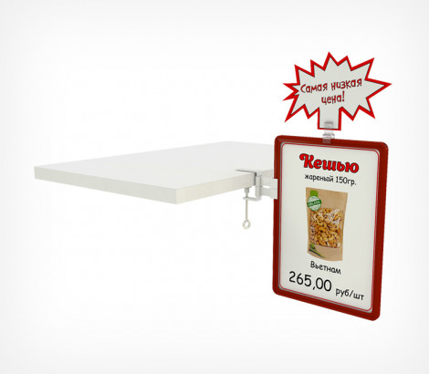 Держатель для крепления дополнительных рекламных вывесок (например, «Акция», «Суперцена», «Скидка» и пр.) Одна сторона клипсы повторяет контур рамки и позволяет закрепить на рамке клипсу, другая сторона имеет держатель, который удерживает вставки толщиной до 3 мм.