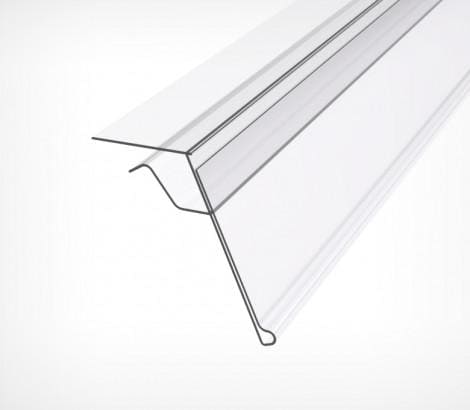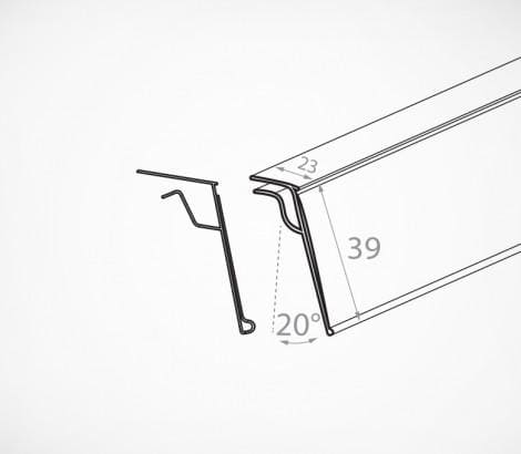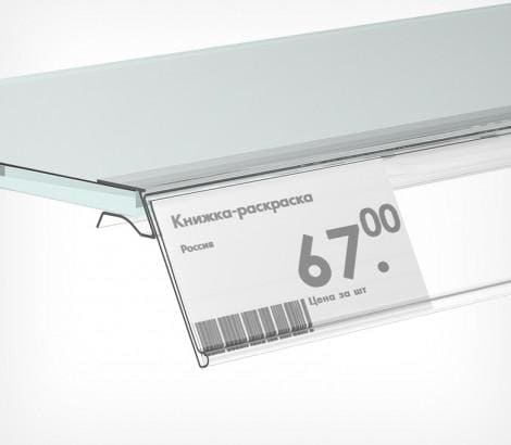 Специальный ценникодержатель для стеклянных полок. Крепится на край полки толщиной до 10 мм. Угол наклона к торцу полки – око- ло 20°. Высота вставляемого ценника – 39 и 26 мм