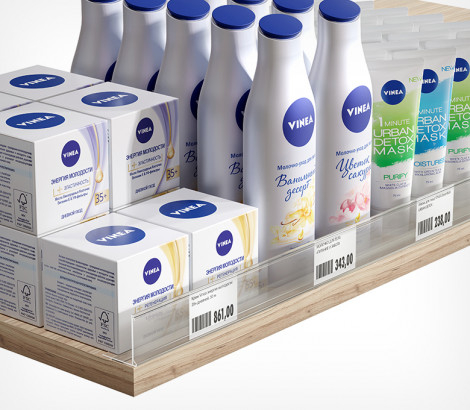 Ценникодержатель ME — это полочный, самоклеящийся ценникодержатель с функцией ограничителя
