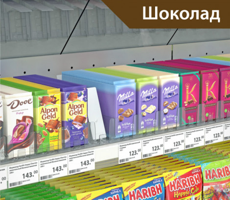 Пружинный толкатель FORTA GROSSA-1 имеет наклонную толкающую поверхность размером 44х132 мм с передним прямым ограничителем 20х25 мм. Разработан для товаров в высокой, твердой и полутвердой упаковке, с неустойчивым основанием, например: плиточного шоколада, сырной, мясной и рыбной нарезок