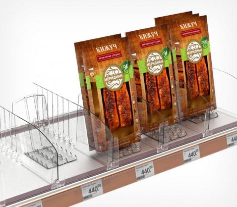 Используется передний профиль с ценникодержателем. Высота рекламной вставки - 30 мм. Имеет Т-профиль для крепления разделителей и толкателей. Крепится на полку на двухсторонний скотч.