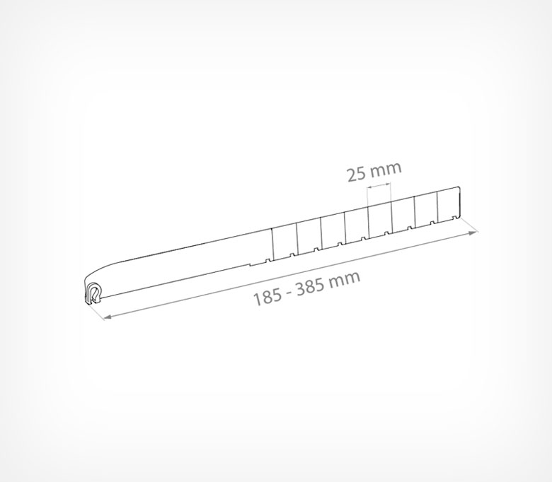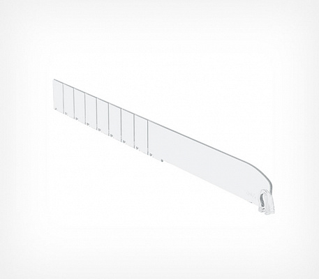 Разделитель DIV30-B выс.30 мм без огран.185-385 мм - предназначен для организации выкладки небольших лёгких товаров, таких как сигареты, лекарства, парфюмерия и косметика. материал: прозрачный ударопрочный пластик, имеет насечки с шагом 25 мм для обламывания по длине. Особенности: подходит для полок глубиной 200–400 мм. Задняя часть разделителя разделена на фрагменты, которые можно отрезать, чтобы регулировать длину. Для крепления на полку нужны специальные профили, которые фиксируются на переднюю и заднюю стороны полки. На передней и задней части разделителя есть вырезы (замки) для фиксации на профиль.