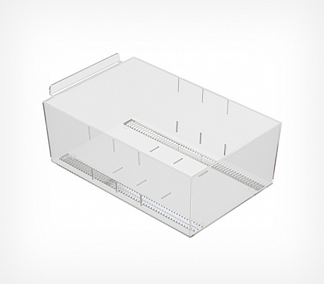 Рифленое дно предотвращает скольжение товара, а прозрачный пластик отлично презентует товар со всех сторон. На лицевой панели могут крепиться самоклеящиеся ценникодержатели. Выдерживает нагрузку до 4 кг.