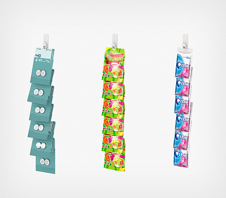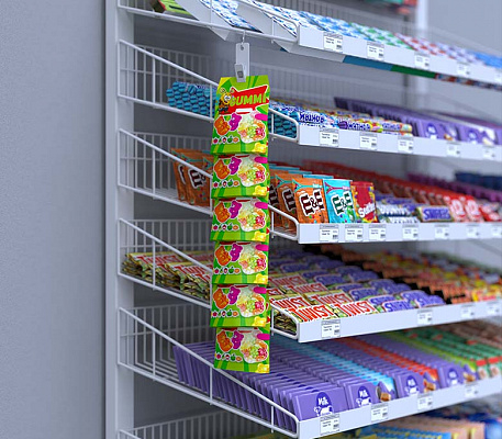 Идеально подходит для размещения продукции с высоким импульсным спросом, такой как сухарики, чипсы, мармеладки, жевательные конфеты и батарейки.